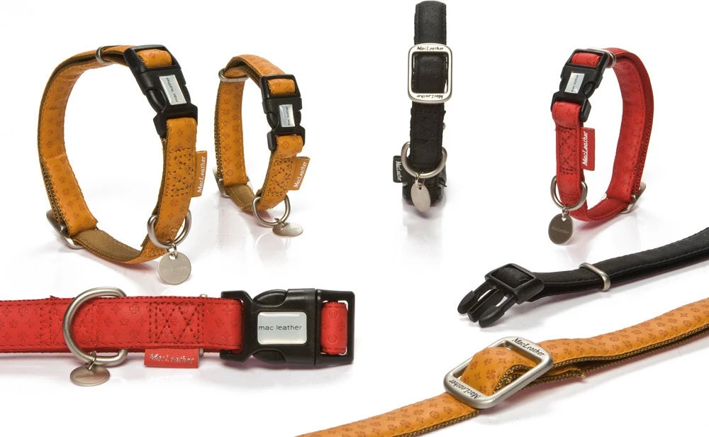 Leuke stoere halsband van imitatieleer, voorzien van een modieus printje. Dubbel gestikt. Binnenzijde nylon. Verstelbaar. Kleur: rood.