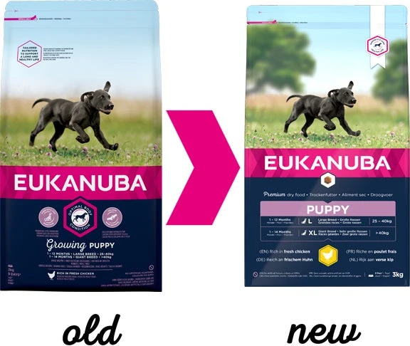 Puppy hondenvoer van Eukanuba is speciaal samengesteld om een optimale lichaamsconditie en een gezonde groei en ontwikkeling te ondersteunen. Geschikt voor puppy’s van grote rassen tot 12 maanden oud en puppy’s van zeer grote rassen tot 14 maanden oud. De smakelijke, grote brokken zijn rijk aan verse kip en speciaal afgestemd op de behoeften van honden van (extra) grote rassen. Bovendien helpt de speciale zeshoekige brok met DentaDefense de tanden van jouw hond te verzorgen.