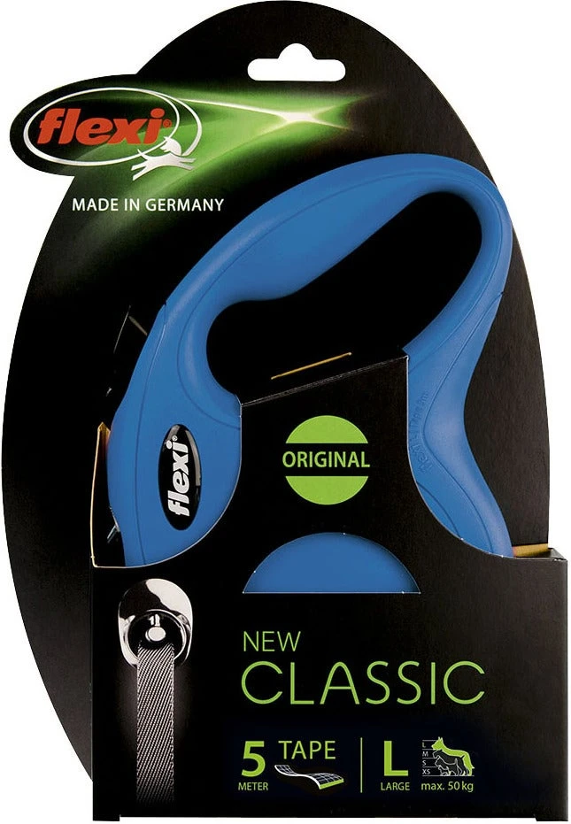 De rollijn Classic Tape van Flexi is een moderne klassieker met een maximale vrije looplengte van 5 meter. Deze hondenriem is geschikt voor grote honden tot ongeveer 50 kg.
