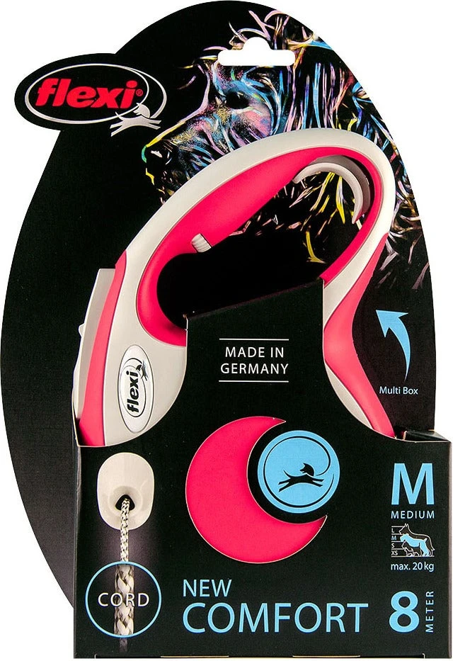 De rollijn New Comfort koord van Flexi is door het perfect afgestemde, tweekleurige design een echte blikvanger. De hondenriem heeft een maximale vrije looplengte van 8 meter en is geschikt voor middelgrote honden tot maximaal 20 kg.