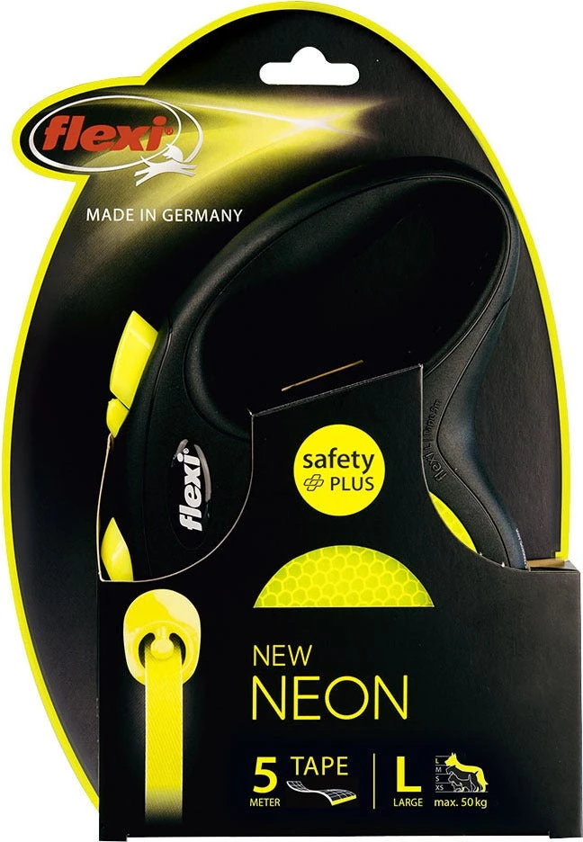 De rollijn New Neon Tape van Flexi is een hondenriem die opvalt. Bij zon door het markante design en in de schemering door haar reflector. Deze hondenriem heeft een maximale vrije looplengte van 5 meter en is geschikt voor grote honden tot ongeveer 50 kg.