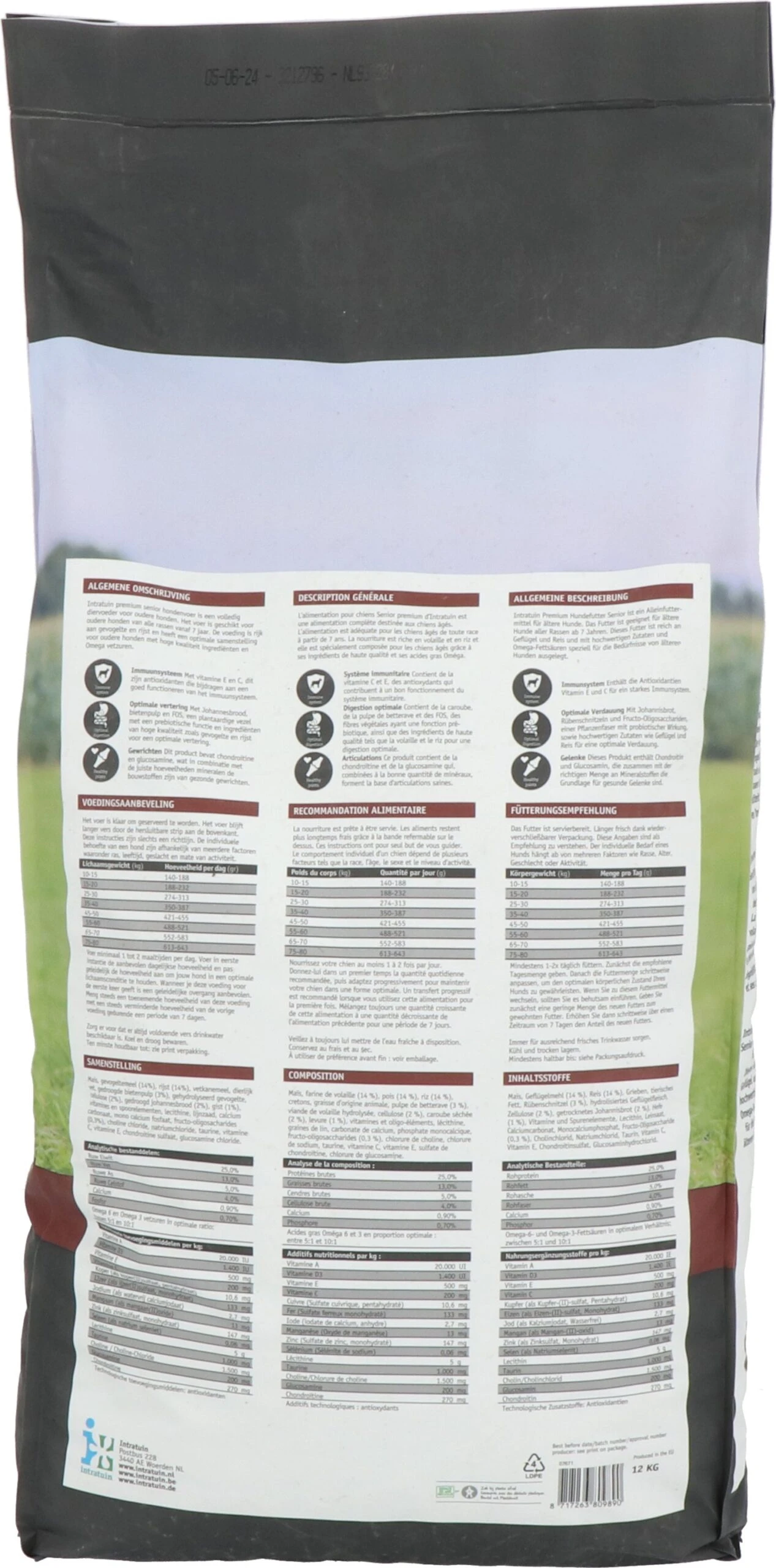 Het Premium hondenvoer senior van Intratuin is een volledig diervoeder voor oudere honden. Het droogvoer is geschikt voor alle rassen vanaf 7 jaar. De voeding heeft een optimale samenstelling voor oudere honden en is rijk aan gevogelte en rijst. De ingrediënten zijn van hoge kwaliteit en bevatten Omega vetzuren.