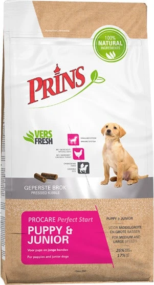 Prins ProCare Perfect Start Junior & Puppy is een geperste voeding speciaal voor pups en jonge honden, vanaf 4 weken tot circa 12 maanden. Deze volledige voeding draagt bij aan een gezonde groei, een goed werkend immuunsysteem en een optimale ontwikkeling van botten en gewrichten. De zorgvuldige geselecteerde ingrediënten zorgen voor een smakelijke, 100% natuurlijke voeding. Zonder toegevoegde synthetische geur-, kleur- en smaakstoffen. Jouw pup krijgt een gelijkmatige opbouw en zal evenwichtig opgroeien tot een volwassen hond. Inhoud: 3 kg.