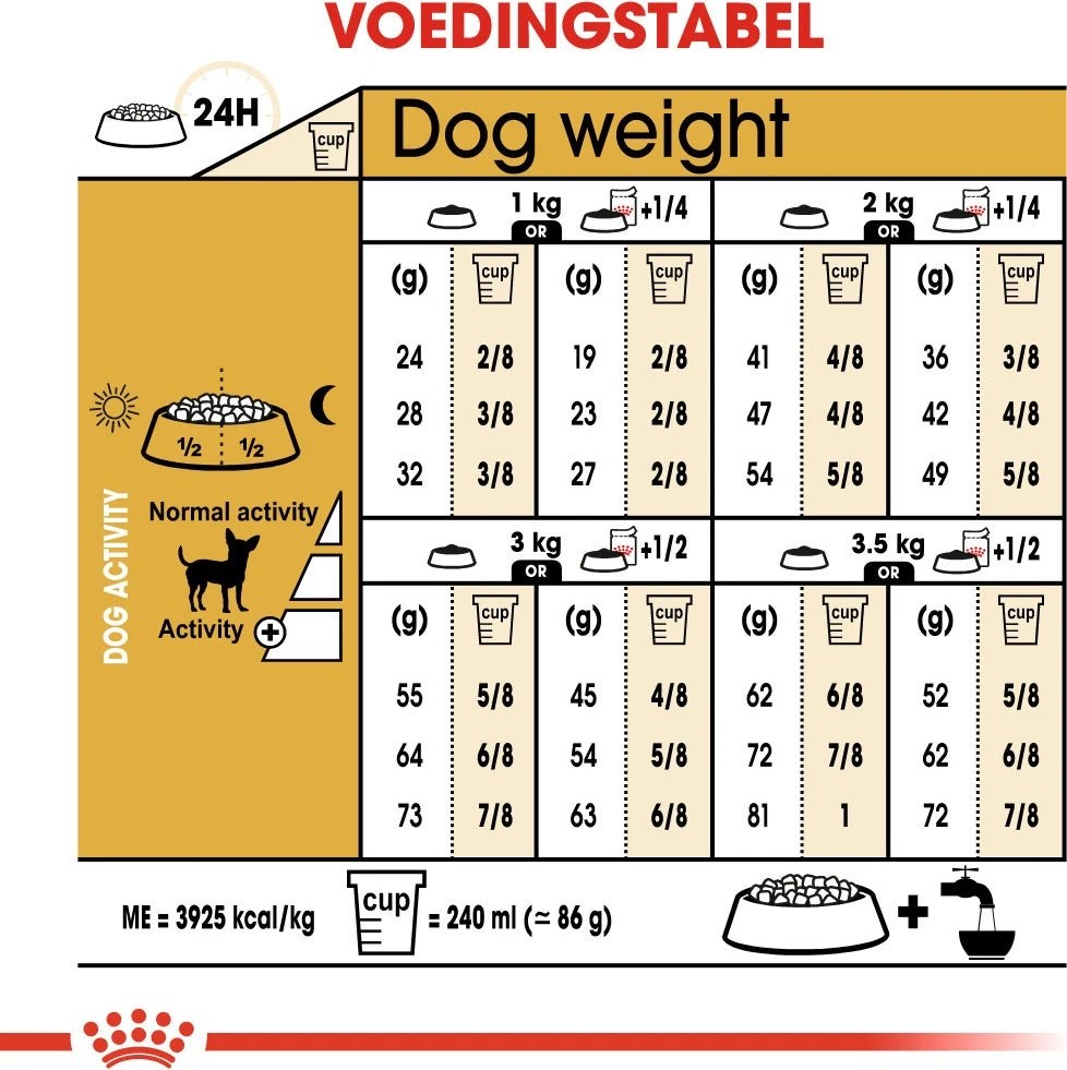 Omdat ook bij honden smaken verschillen, is Royal Canin Chihuahua Adult ook verkrijgbaar als zacht en smakelijk natvoer. Volg de voedingsrichtlijnen op de verpakking als je van plan bent om je hond gemengd te voeren. Zodat hij de optimale hoeveelheden droog- en natvoeding voorgeschoteld krijgt.