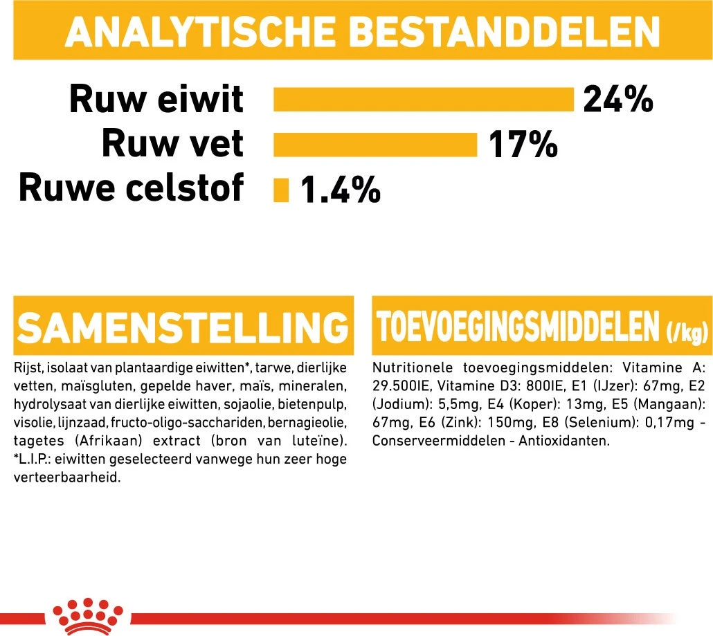 Royal Canin Dermacomfort Mini bevat zorgvuldig geselecteerde eiwitten. De speciaal ontwikkelde hondenvoeding helpt de huid van je hond in een goede conditie te houden. Daarnaast helpt het de dichte en gezonde vacht van je hond te behouden.