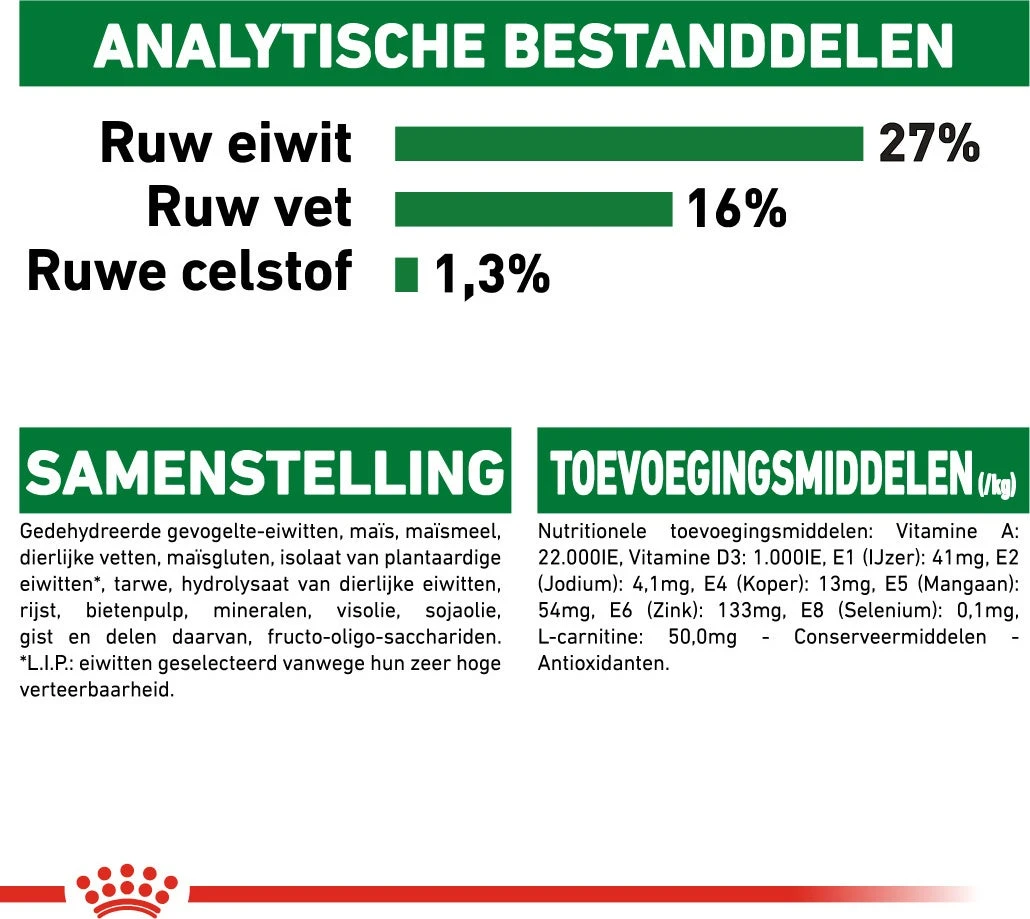 Honden van een klein ras hebben over het algemeen een hoge energiebehoefte. Royal Canin Mini Adult is speciaal samengesteld met voedingsstoffen die daaraan voldoen en helpt hem een gezond gewicht te behouden. De voeding bevat L-Carnitine.