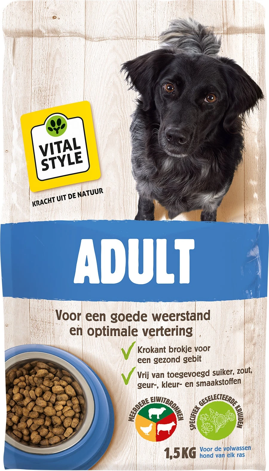 In ADULT hondenbrokken van VITALstyle (voorheen ECOstyle) zit alles wat je hond nodig heeft. De smakelijke brokjes met kruiden zijn krokant. Goed voor het gebit en een actieve spijsvertering. In ADULT zitten veel verschillende ingrediënten: meerdere soorten vlees (diverse, goed verteerbare eiwitbronnen), granen en andere natuurlijke grondstoffen. Dat doen we bewust. Het daagt de spijsvertering van je hond uit en zorgt voor een goede vertering. Er ontstaan geen eiwitreststoffen die voor problemen kunnen zorgen. Omega 3 + 6 en prebiotica helpen ook mee.